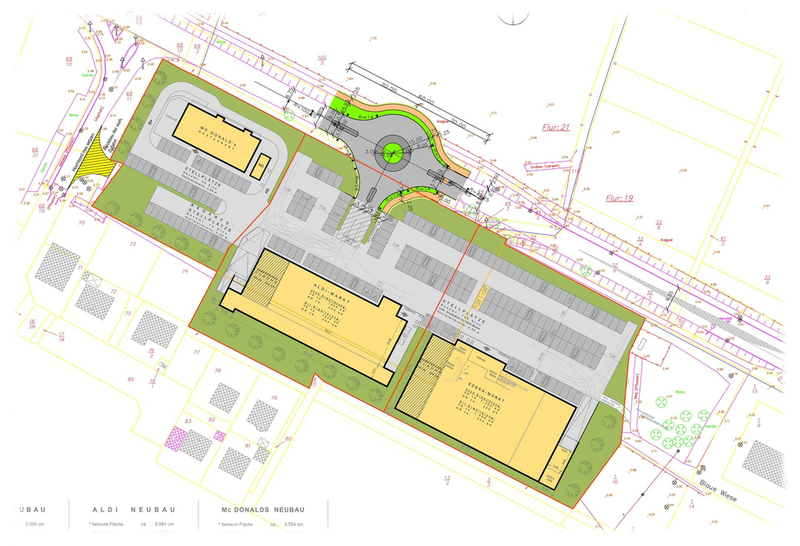 Im Bereich Blaue Wiese / Umgehungsstraße ist die Neubebauung mit zwei baulich getrennten Einzelhandelseinrichtungen, einem ergänzenden Schnellrestaurant mit Drive-In-Angebot samt zugehörigen Zufahrten, Anlieferung und Parkierungsfläche geplant. In diesem Rahmen ist auch die Verschiebung und Neugestaltung der Anbindung an die Umgehungsstraße in Form eines Kreisverkehres vorgesehen. Aufgrund des Umfangs des Vorhabens sowie der erheblichen zu berücksichtigen städtebaulichen Belange, insbesondere der Einbindung in das Siedlungsbild, der Herstellung einer geordneten und gesicherten Erschließung sowie der Anforderungen eines hinreichenden Schallimmissionsschutzes angrenzender Baugebiete, wird die Aufstellung eines Bebauungsplans erforderlich.