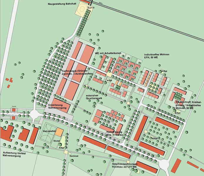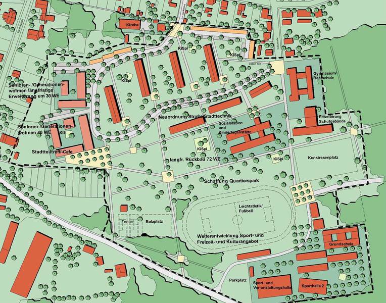 Neben den bestehenden Fördergebieten „Ortskern und Scheunenviertel“ sowie „Kronskamp“ im Programm „Stadtumbau“ zeichnet sich für das aus den 1960er Jahren stammende Quartier Rudolf-Harbig-Straße, wegen des höheren Alters der Mieter, in den nächsten Jahren Handlungsbedarf ab. Aufgrund der Erfahrungen mit der Siedlung Kronskamp möchte die Stadt beim Quartier Rudolf-Harbig-Str. frühzeitig einer Leerstandsentwicklung und sozialer Entmischung entgegenwirken. Daher wurde ein teilräumliches Konzept einschließlich Umsetzungs- und Finanzierungsplanung erarbeitet. Im Fokus der Neuordnung stehen die Erneuerung der maroden technischen Infrastruktur sowie die funktionale Weiterentwicklung der am Standort bestehenden Infrastruktureinrichtungen und der Sport- und Freiflächen zu einem „Campus der Generationen“.