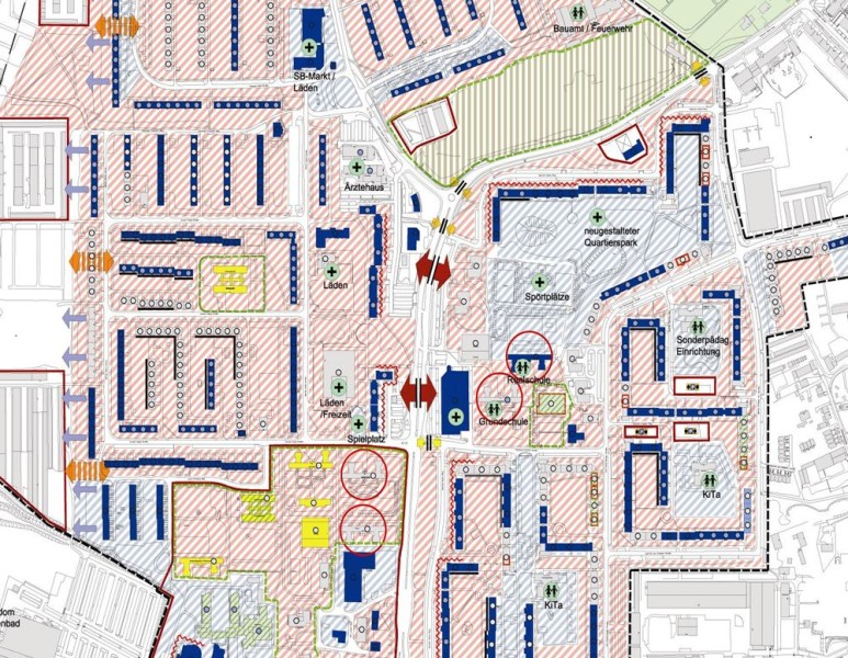 Da die Leerstandssituation sich moderat gestaltete und erst für die mittlere Zukunft aufgrund der Altersstruktur von einer diesbezüglich deutlich negativen Entwicklung auszugehen war, ergab sich hier die Chance eine langfristige und nachhaltige Umbaustrategie zu entwickeln. Ziel war dabei, den Rückbau gezielt für eine Aufwertung des Stadtteils einzusetzen, also z.B. enge, schlecht belichtete Wohnlagen aufzulockern, zusammenhängende neue Freibereiche und Grünzüge zu schaffen oder den Stadtteil an den Rändern zurückzubauen und Siedlungsfläche an die Natur zurückzugeben. Dazu wurden verschiedene alternative Planungsansätze entwickelt und gemeinsam anhand eines standardisierten Kriterienkatalogs bewertet, in dem neben wohnungswirtschaftlichen Aspekten auch solche der stadträumlichen und Aufenthaltsqualität, der Erschließung und Versorgung sowie von Umwelt und Natur Berücksichtigung fanden.