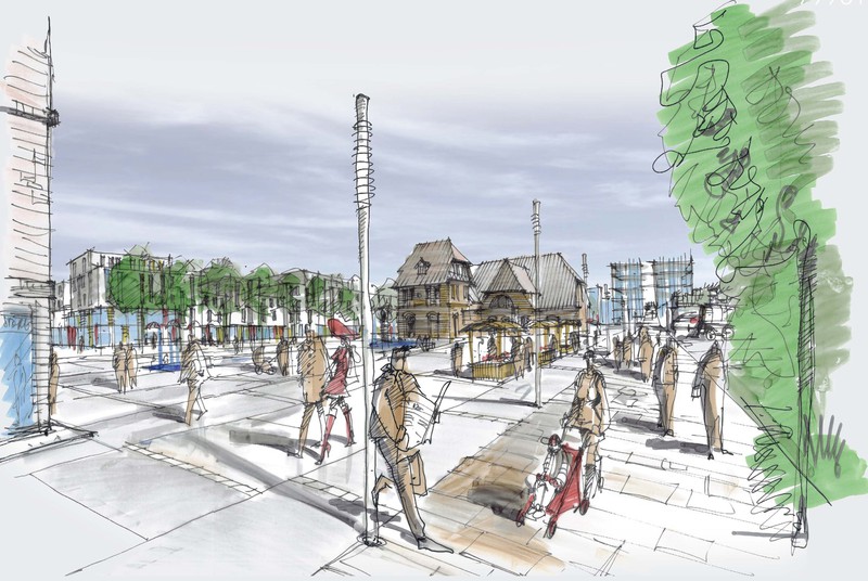 Im Kern des zu entwickelnden Areals steht ein grünes autoarmes Wohnquartier, welches an die ehemals dort bestehende Schwedenschanze, aus dem 17. Jahrhundert anknüpft und als grüne Hügellandschaft gestaltet ist. Insgesamt entsteht hier eine differenzierte Gebäude- und Freiraumstruktur mit großzügigen und gleichzeitig individuellen Wohnungsangeboten sowie privaten und halböffentlichen Aufenthaltsräumen. Kernstück des Freiraumkonzepts ist die „Bahnhofsplaza“, welche die per Schiff, Bahn und Bus ankommenden Besucher empfängt und gleichzeitig die Verbindung von Ortskern und Altem Strom zum Seekanal herstellt.