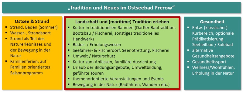 Im Rahmen der zukünftigen Tourismusentwicklung strebt die Gemeinde Ostseebad Prerow gleichermaßen eine Festigung und einen weiteren Ausbau ihrer Alleinstellung des besonderen kulturellen Angebots sowie auch ihrer Position als Ostseebad an. Dazu wird eine Schärfung der touristischen Positionierung unter den Themen „Ostsee und Strand“, „Landschaft und (maritime) Tradition“ sowie „Gesundheit“ verfolgt. Vor allem die zuletzt genannte Säule birgt deutliches Alleinstellungspotenzial in der Entwicklung alternativer Gesundheitsangebote jenseits des klassischen Kur- und Bäderwesens.